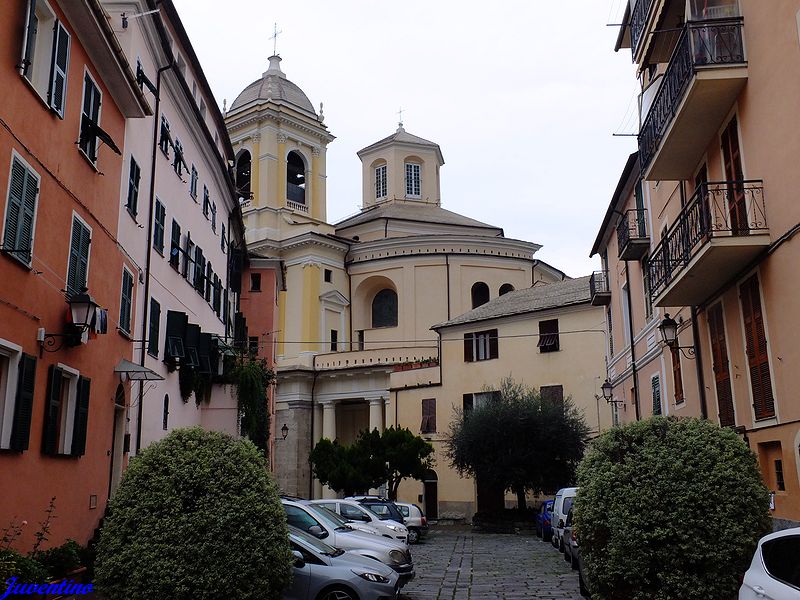 Nous débouchons sur une place face à la plus grande église de Pieve di Teco, la chiesa collegiata di San Giovanni Battista édifiée entre 1782 et 1806 dans le style néo classique.